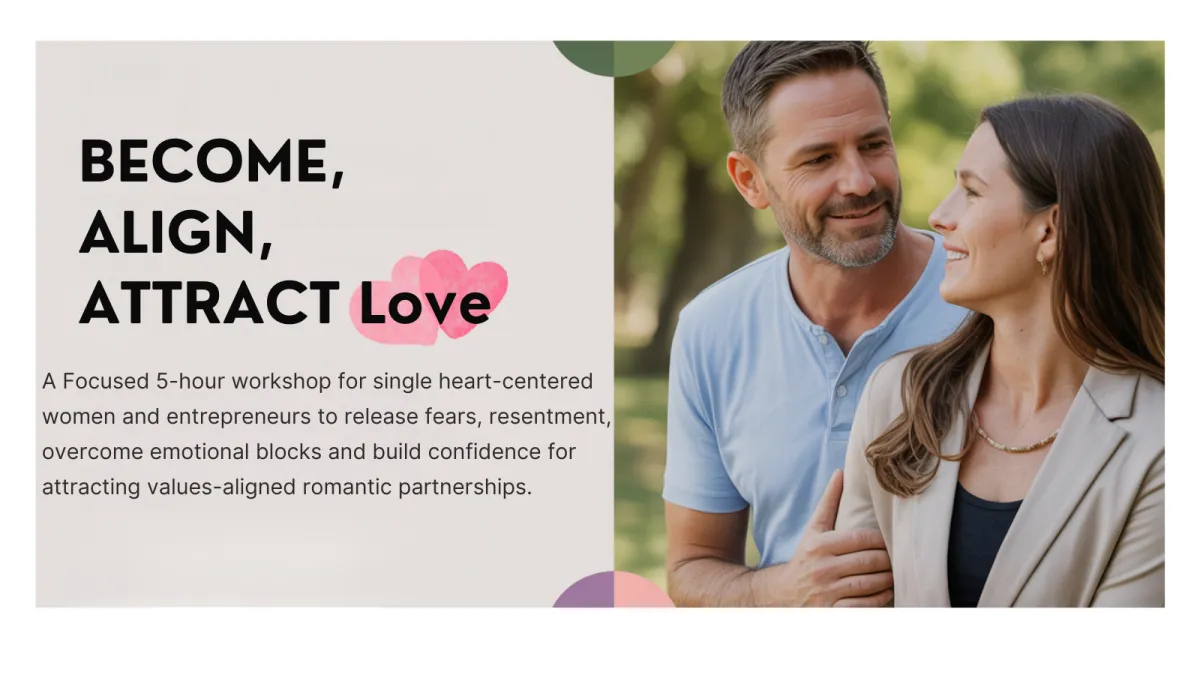 A focused 5-hour live online class for heart-centered, single women, men, and entrepreneurs to release fears and resentment, overcome emotional blocks, and build unshakable confidence for attracting values-aligned romantic partnerships.